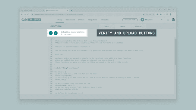 To upload the code to the Nicla Vision from the online editor, click the green Verify button to compile the sketch and check for errors, then click the green Upload button to program the board with the sketch.